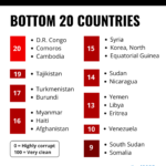 • The lowest scores on the index include Eritrea, Libya and Yemen (13), Venezuela (10), and Somalia and South Sudan (9).