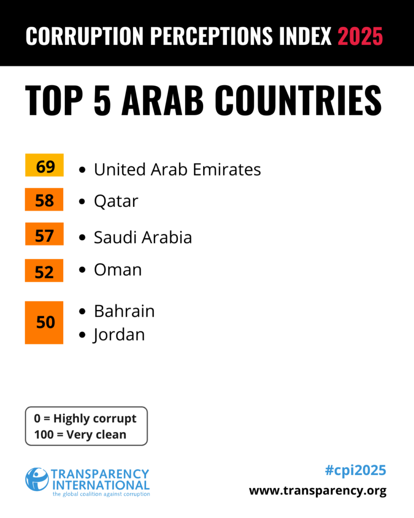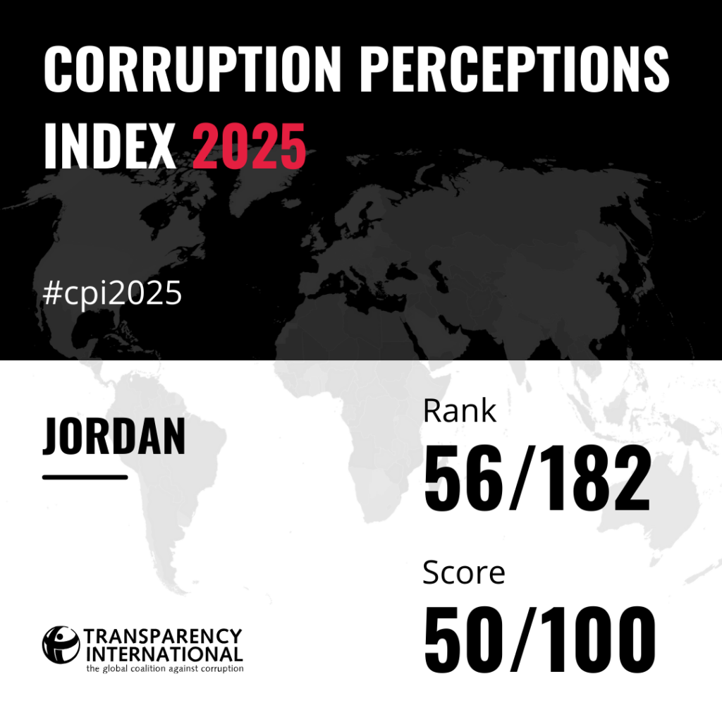 • Jordan improved by one point compared with 2024, scoring 50 out of 100 on the CPI 2025 (where 0 indicates high levels of perceived corruption and 100 indicates very clean). Jordan ranks 56th out of 182 countries and territories assessed.